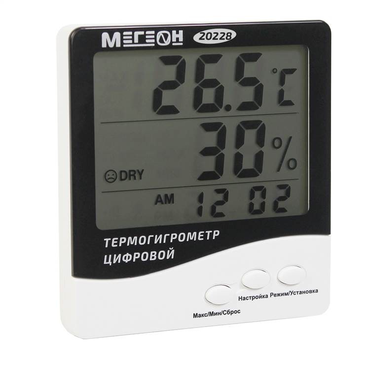 Цифровой термогигрометр МЕГЕОН 20228 - прибор для измерения температуры и влажности в помещении. Прибор имеет простой интерфейс и понятные настройки, а также оснащен большим высококонтрастным жидкокристаллическим дисплеем, на котором одновременно отображаются и измеренные температура и влажность, а также текущее время. Благодаря современному эргономичному дизайну термогигрометр идеально впишется в интерьер любого дома, а функция фиксации минимального и максимального значений температуры будет полезной при использовании прибора в загородных домах, банях и складских помещениях. Для отображения данных температуры доступно две единицы измерения: °C и °F. Измеритель также успешно заменит настольные часы и станет незаменимым помощником, способным заменить три отдельно взятых изделия: термометр, гигрометр и будильник.