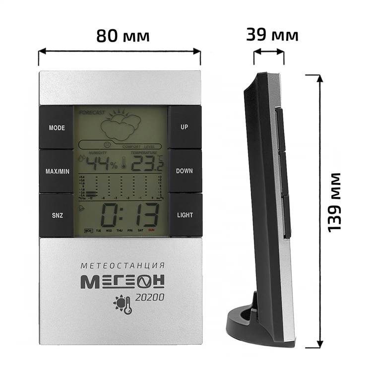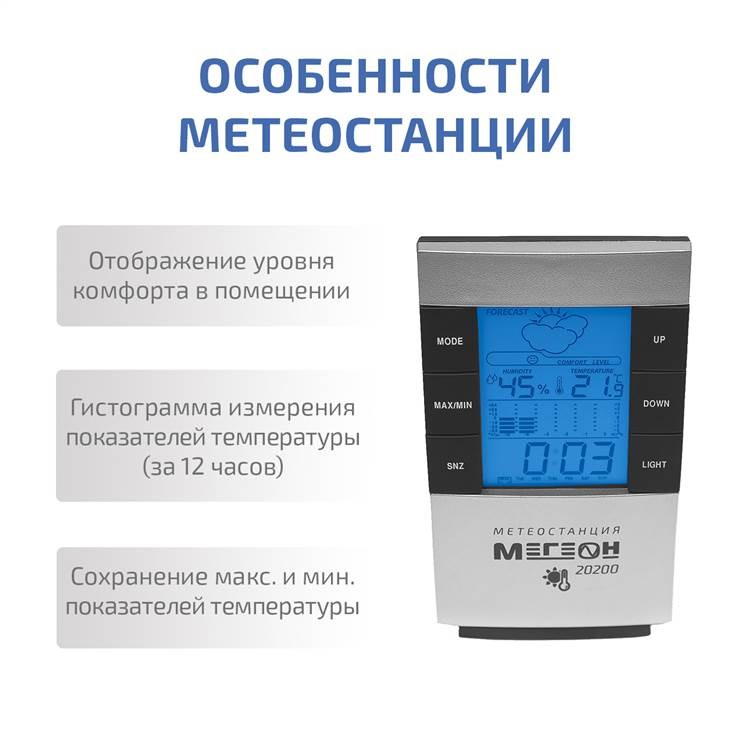 Настольный цифровой термогигрометр МЕГЕОН 20200 - это устройство, предназначенное для контроля температуры и влажности внутри помещения. Прибор имеет широкий диапазон измерений температуры от 0 °C до 50 °C и влажности от 20 % до 99 %, а точность измерения составляет ±1 °C и ±5 % соответственно.