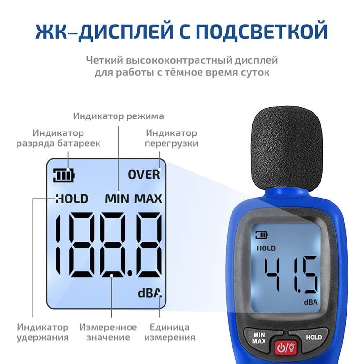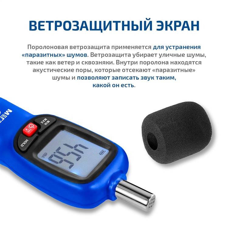Индикатор разряда батареи предупредит вас о необходимости замены элемента питания, чтобы обеспечить непрерывность измерений. В комплекте с прибором идет ветрозащитный экран, который предотвратит искажение показаний из-за влияния ветра. При длительном простое шумомер автоматически отключается, экономя заряд батареи и продлевая ее срок службы.