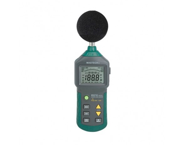 Цифровой шумомер Mastech MS6700 - позволяет измерять уровень громкости звука и шумов в большом диапазоне и с высокой точностью. Прибор имеет специальный измерительный микрофон, обладающий очень малой неравномерностью АЧХ и высокой чувствительностью, усилитель, корректирующий фильтр и большой ЖК-дисплей для отображения полученных результатов измерения. Помимо цифровой индикации результатов измерения в шумомере Mastech MS6700 предусмотрена графическая шкала для мнемонического отображения величин. Прибор можно подключать к персональному компьютеру с помощью последовательного порта RS-232 для последующей обработки полученных данных. В условиях недостаточной видимости подсветка дисплея поможет прочитать полученные данные. Питание прибора осуществляется с помощью батареи питания 9 В типа "Крона" или внешнего адаптера питания 9 В.