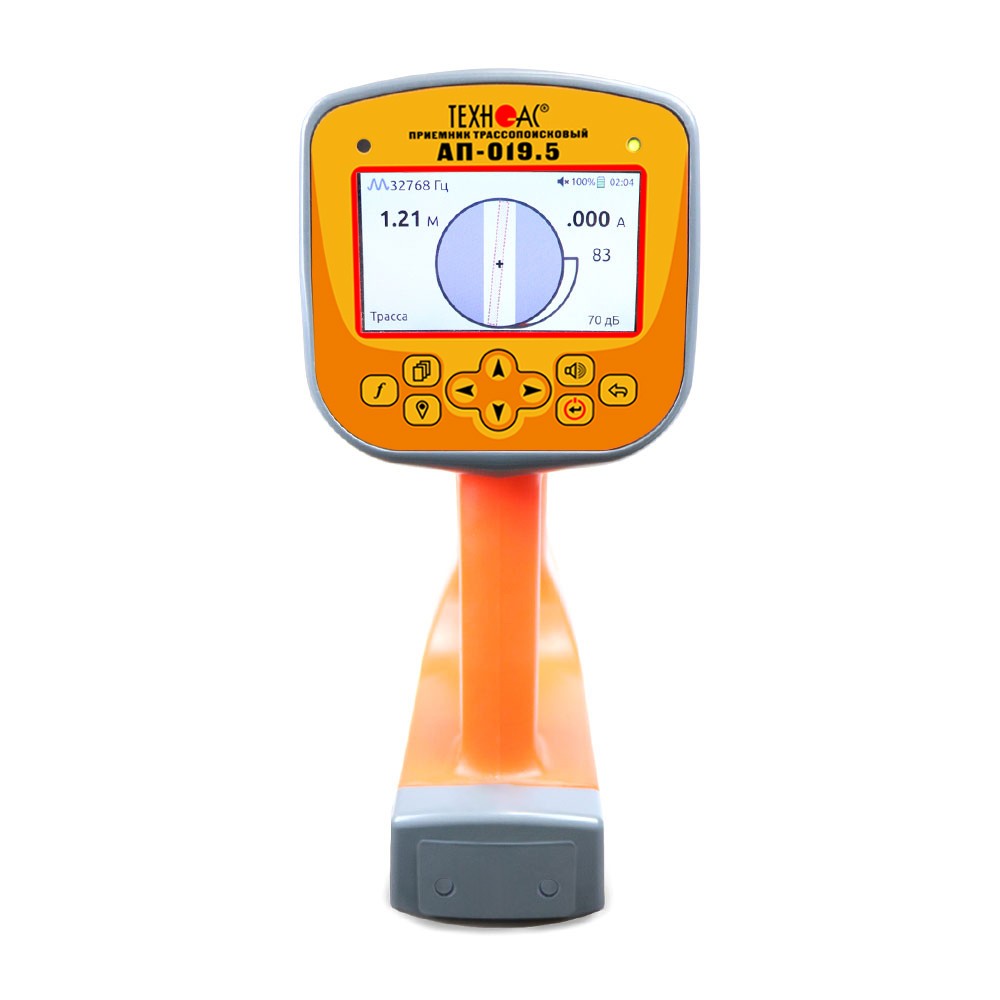 В составе комплекта приемник в виде моноблока с цветным ЖК дисплеем, на который выводится изображение трассы и в автоматическом режиме происходит расчет глубины залегания коммуникации до 30 м, а также величины тока в линии и самый мощный мультичастотный генератор в линейке ТЕХНО-АС, с дальностью работы до 10 км.