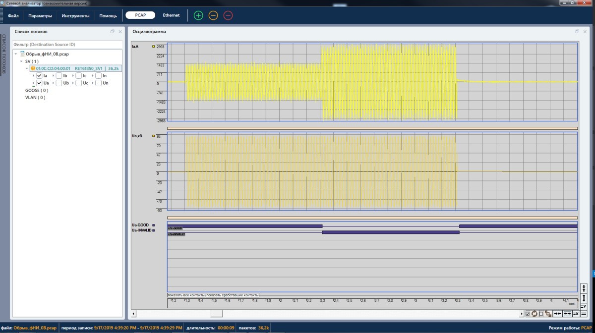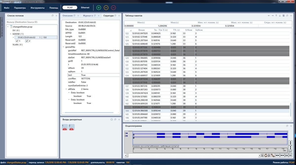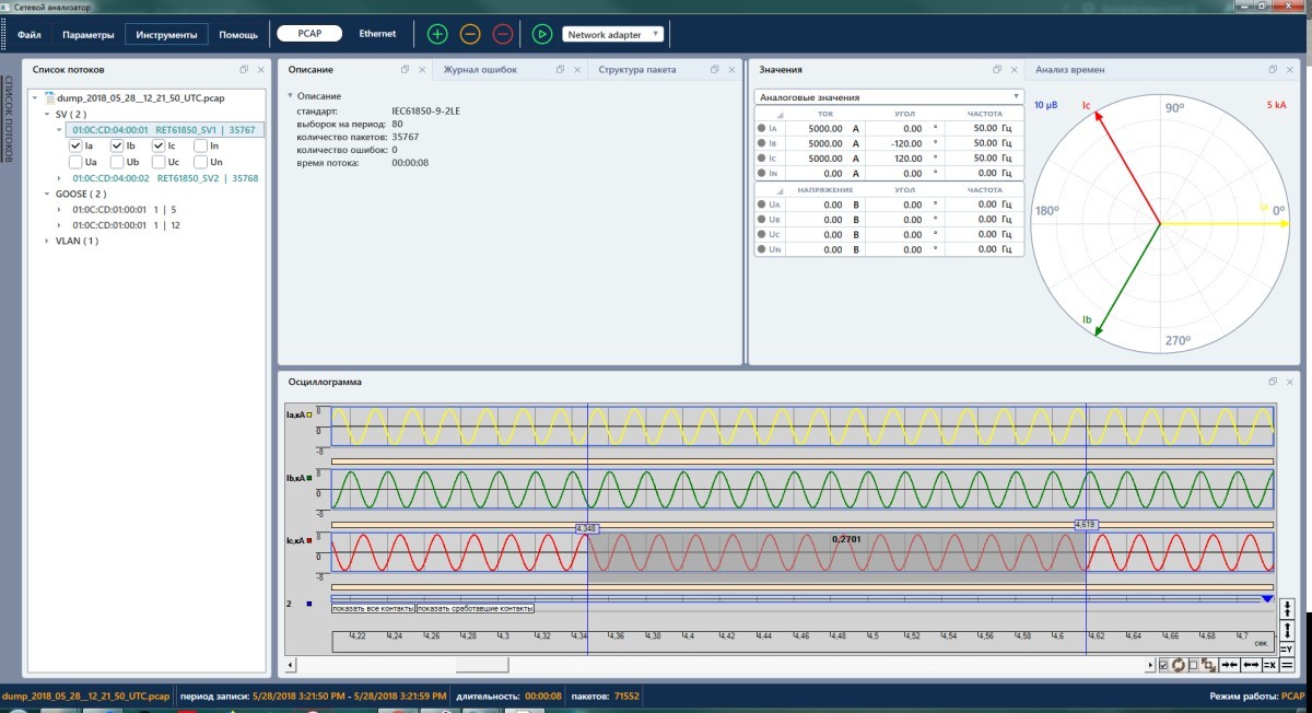 ПО "Сетевой анализатор" позволяет проводить мониторинг и анализ поведения оборудования ЦПС с поддержкой МЭК 61850-9-2LE, МЭК 61869-9 (SV) и МЭК 61850-8-1 (GOOSE):
