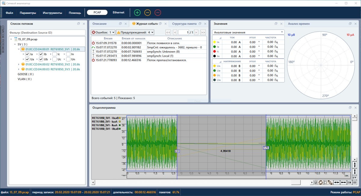 Программное обеспечение «Сетевой анализатор» работает независимо от комплексов РЕТОМ-61850 и РЕТОМ-51/61/71 – для проведения проверок необходим лишь компьютер. Удобный и понятный для специалистов-релейщиков интерфейс ПО содержит необходимый для оценки поведения оборудования ЦПС набор инструментов: осциллограф, векторную диаграмму, таблицы сообщений, график распределения задержек в сети.