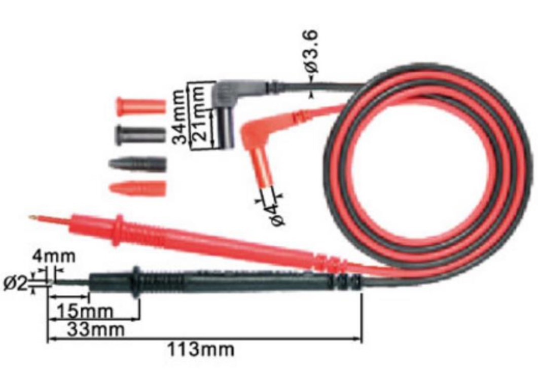 Измерительные щупы для мультиметров. Комплект состоит из красного и черного щупов, с изоляцией из ПВХ и угловыми укрытыми в корпус однополюсными штепселями (типа "банан") с заглушками.