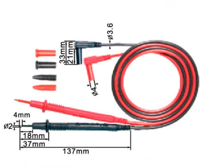 Измерительные щупы для мультиметров. Комплект состоит из красного и черного щупов, с изоляцией из ПВХ и угловыми укрытыми в корпус однополюсными штепселями (типа "банан") с заглушками.