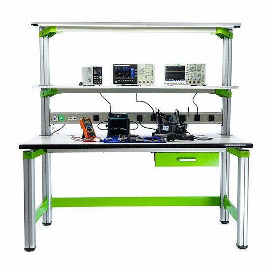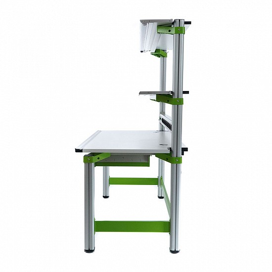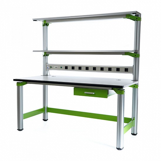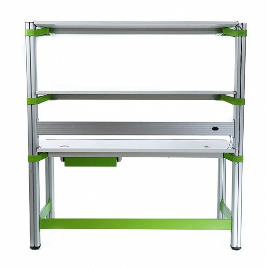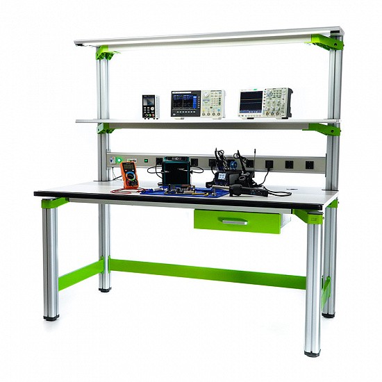 - Антистатическое исполнение столешницы;Блок из 9 розеток с выключателем;Две полки 160х36 см для инструментов;Светодиодная подсветка с креплением на одну из полок;Выдвижной ящик;Прочная конструкция: профиль и соединительные элементы из алюминия;Антипрокольная полоса на кромке столешницы;Высота столешницы 78 см;Предельная нагрузка 300 кг