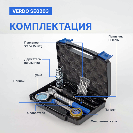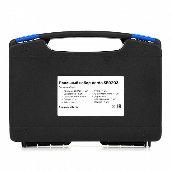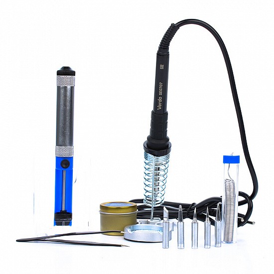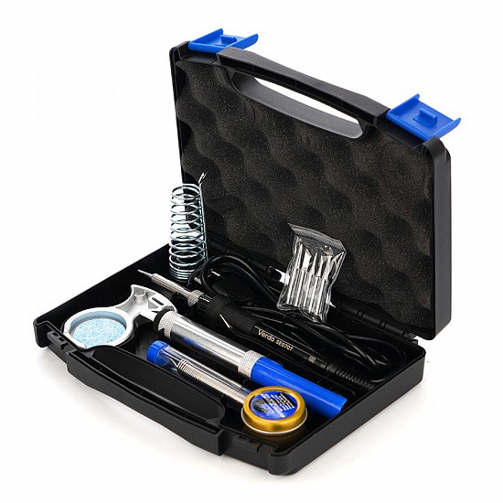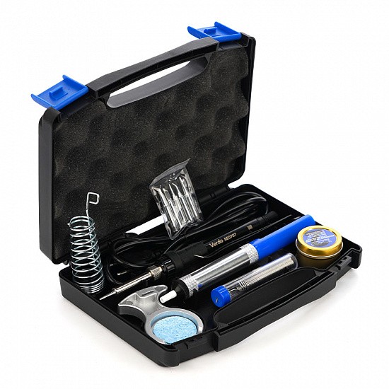 Паяльный набор для монтажа и ремонта VERDO SE0203 в пластиковом кейсе, предназначенный для выполнения различных задач пайки. В набор входит современный паяльник мощностью 60 ватт с регулятором температуры; контроллер температуры позволяет задавать температуру пайки в пределах 220-480°C. Удобная ручка, с защитным кольцом, Анти-статические конструкции, дополнительных крокодил провод заземления, все это делает работу с паяльником удобной и безопасной. Паяльник предназначен как для обычного олова, так и бессвинцового припоя.