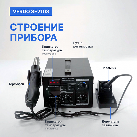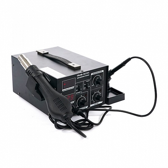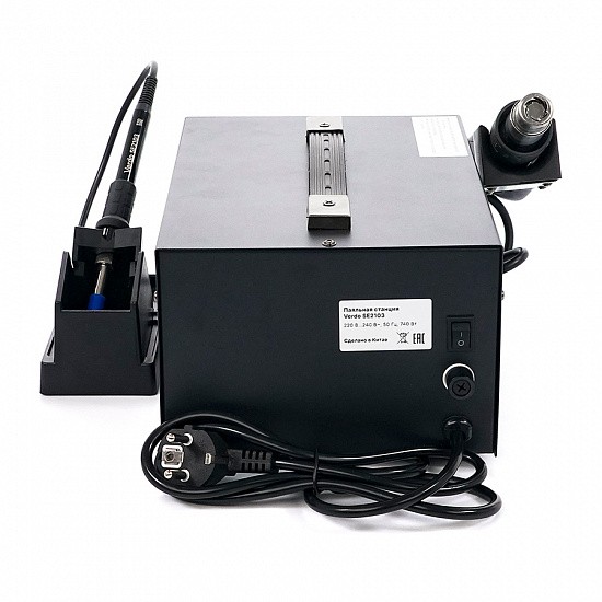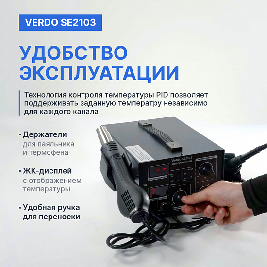 VERDO SE2103 оснащена цифровой индикацией фактической температуры потока горячего воздуха, что обеспечивает минимальную погрешность при работе с различными материалами. Широкий диапазон рабочих температур позволяет использовать паяльную станцию в различных условиях. Дополнительный держатель фена делает использование станции более удобным, повышая производительность и качество пайки.