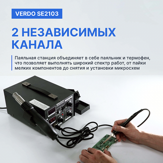 Двухканальная паяльная станция VERDO SE2103 предназначена для монтажа и демонтажа электронных компонентов, включая SOIC, CHIP, QFP, PLCC, BGA и SMD. Является отличным выбором для работы с FFC, FPC элементами.