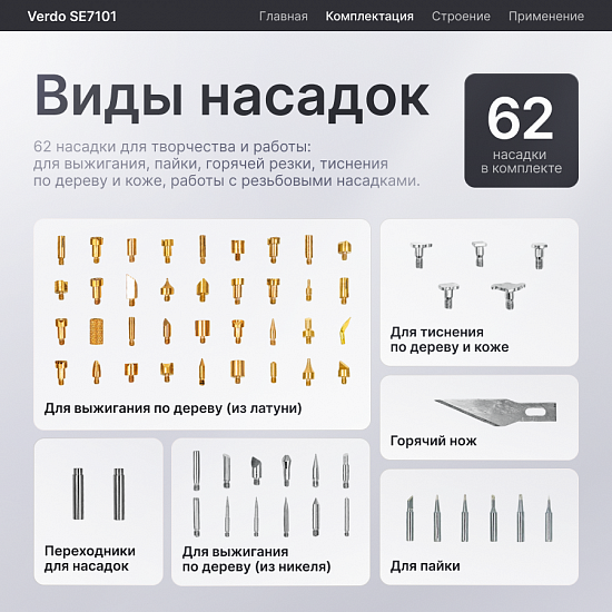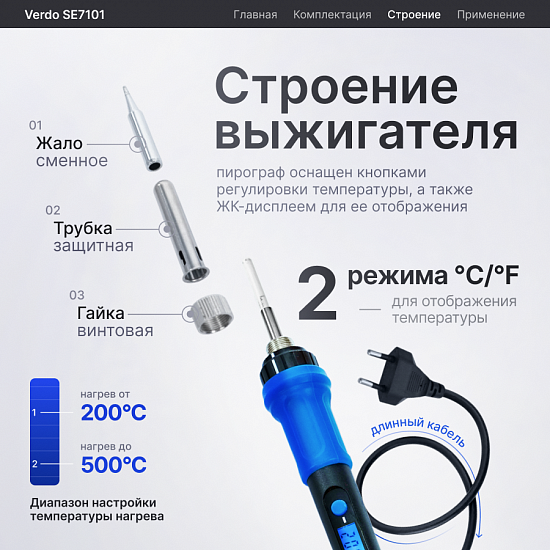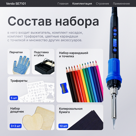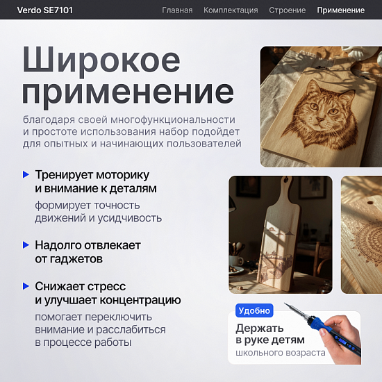 Verdo SE7101 — это многофункциональный прибор для пирографии, сочетающий точность профессионального оборудования с удобством использования в домашних условиях. Идеально подходит для создания художественных работ, декоративных изделий и поделок из дерева.
