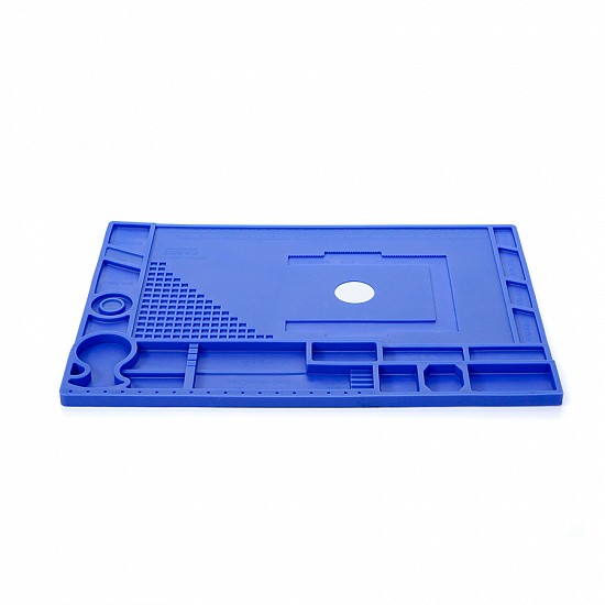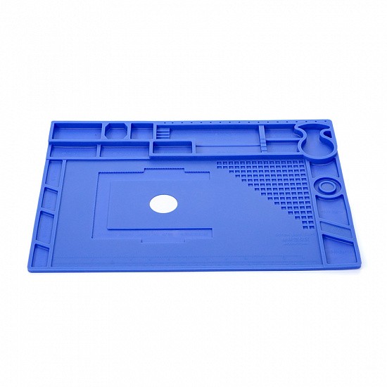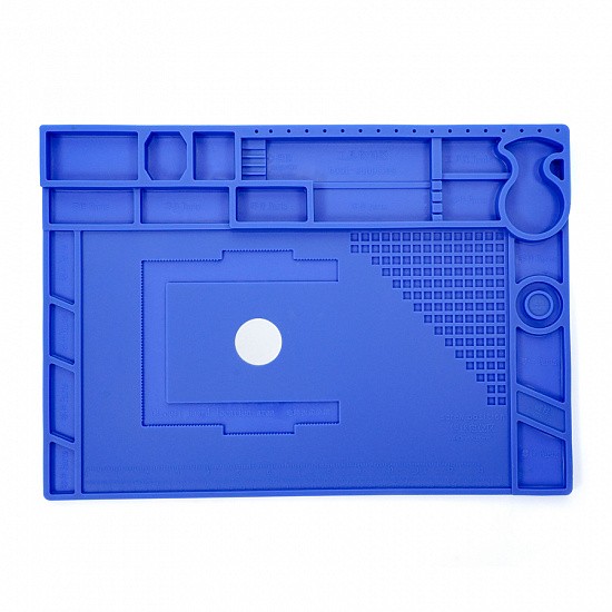 Коврик защищает стол от горячих капель припоя, а наличие ячеек для хранения винтов, запасных частей и инструментов помогает поддерживать порядок на рабочем месте. Некоторые ячейки оснащены магнитным основанием, что позволяет использовать их для удержания мелких металлических предметов. Легко очищается от пыли, остатков олова и других загрязнений.