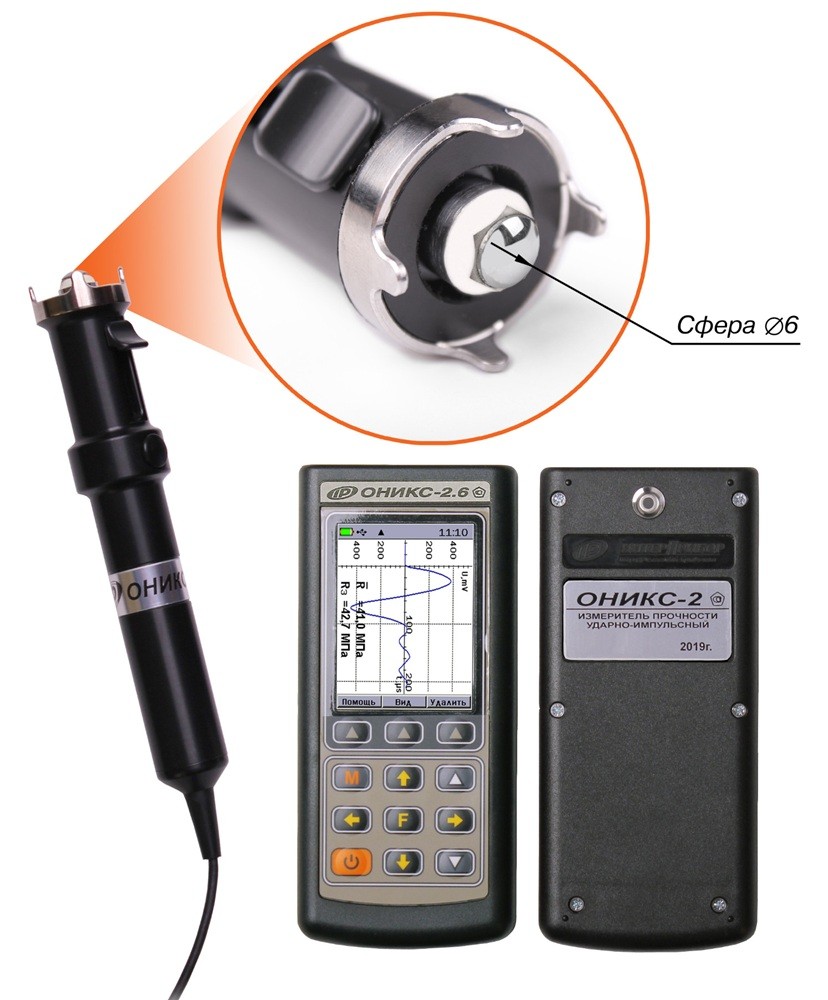 ОНИКС-2.6 версия 1 состоит из склерометра с радиусом индентора 6 мм. и электронного блока. Данный вариант исполнения (Версия 1) измерителя прочности строительных материалов говорит о наличии в конструкции пирометра (прибор, позволяющий измерять температуру поверхности тел бесконтактно).
