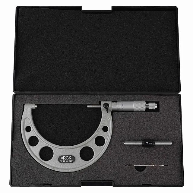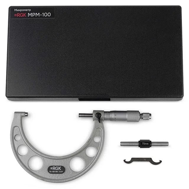 Микрометр RGK MPM-100 предназначен для контроля геометрических параметров изделий, обеспечивая определение их наружных размеров в диапазоне от 75 до 100 мм с разрешением 0,01 мм. Инструмент оптимизирован для работы с цилиндрическими деталями, для чего оснащен полукруглой скобой.