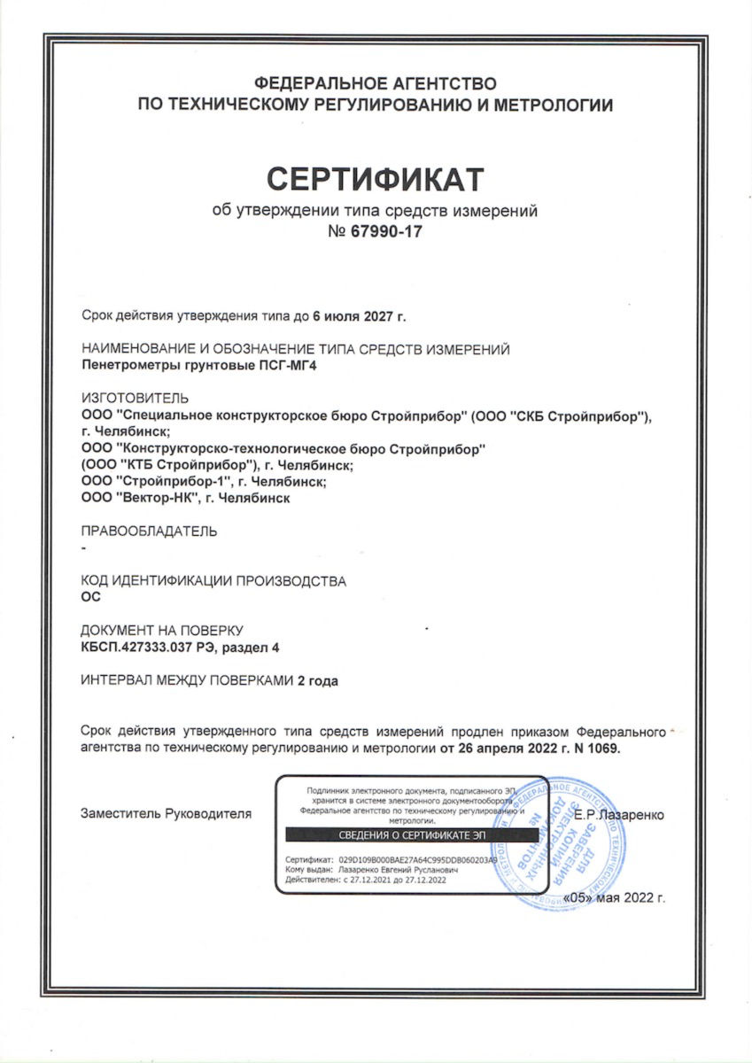 Пенетрометр статического действия ПСГ-МГ4 предназначен для ускоренного контроля качества уплотнения грунта, а также прочностных характеристик грунтов земляного полотна – угла внутреннего трения, удельного сцепления, модуля упругости.