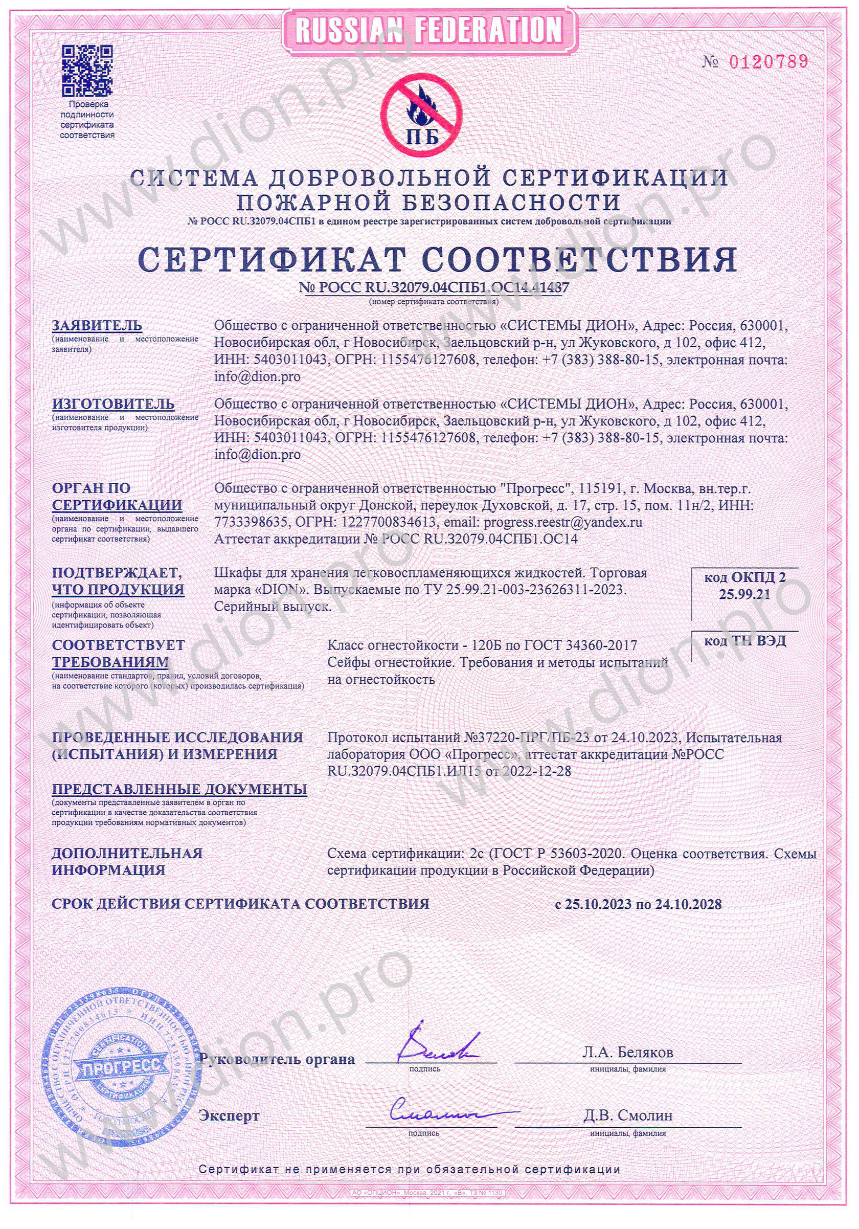 Шкафы для хранения ЛВЖ от DION это максимальная надежность и полное соответствие требованиям пожарной безопасности. Класс огнестойкости 120Б подтвержден сертификатом противопожарной безопасности |