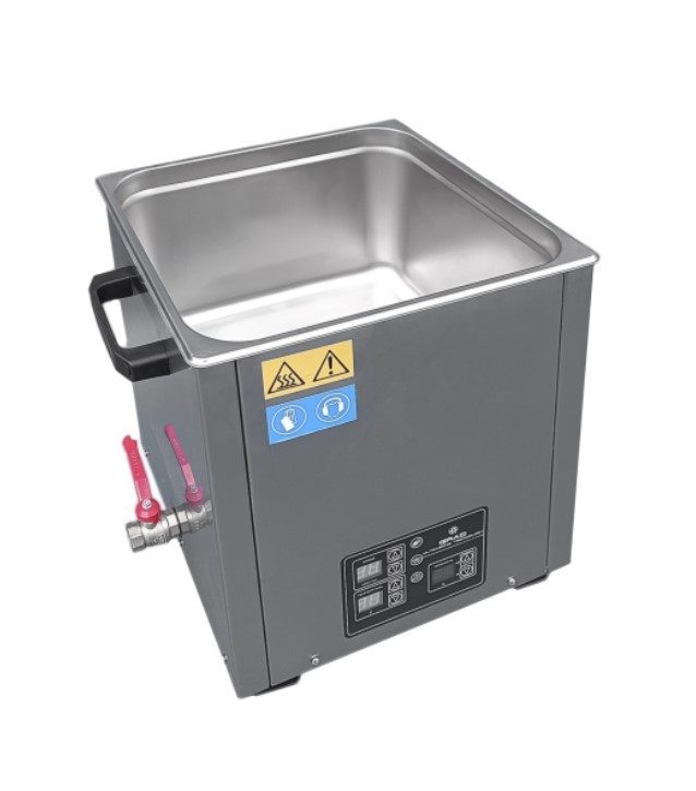 Максимальная нагрев рабочей жидкости – до 80°С. Нагрев осуществляется посредством ТЭНов суммарной мощностью 300 Вт. Температурное падение, при котором снова происходит включение ТЭНа: -1°С. Длительность обработки изделий задаётся при помощи электронного таймера с максимальным пределом установки времени до 100 мин. Органы управления расположены на герметичной панели управления, размещенной на лицевой стенке корпуса. Установка оборудована системой слива.