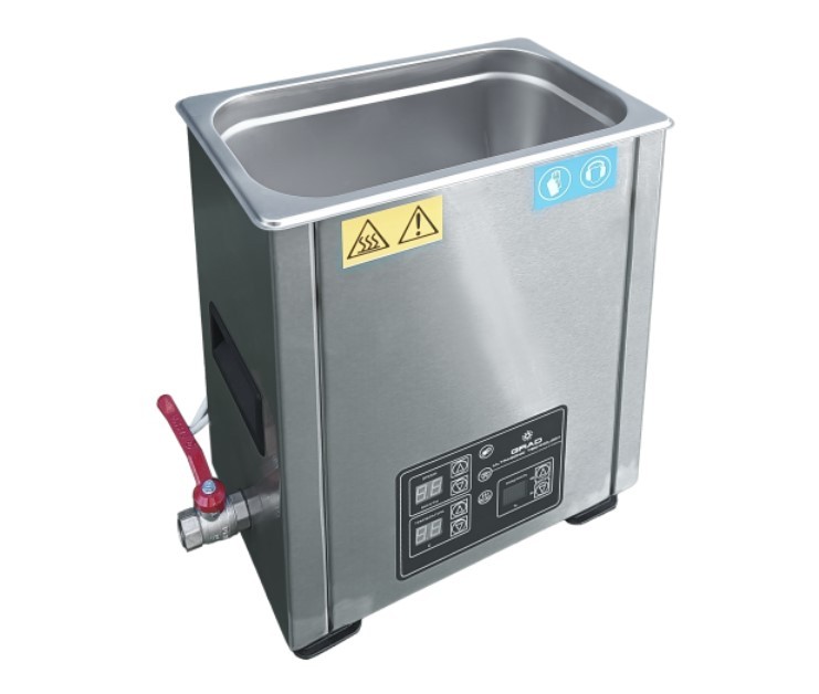 Данная модель оснащена системой подогрева мощностью 150 Вт с функцией автоматического поддержания заданной температуры рабочей жидкости, позволяющей осуществлять нагрев до 80°С. Температурное падение, при котором снова происходит включение ТЭНа: -1°С. Длительность обработки изделий задаётся при помощи электронного таймера с максимальным пределом установки времени до 100 мин.
