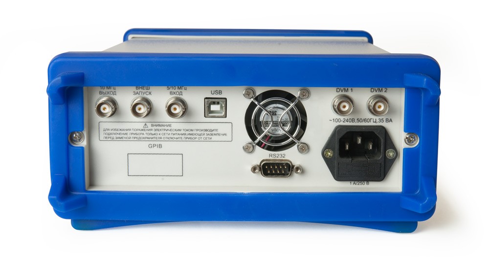 На задней панели частотомеров расположены разъем шнура сетевого питания, гарантийная пломба, выход опорного генератора, входы внешнего запуска и внешнего опорного генератора, а также наклейка с указанием используемой в частотомере опции опорного генератора.
