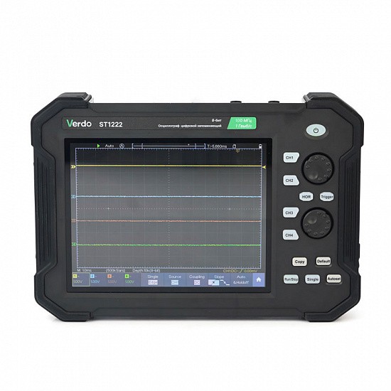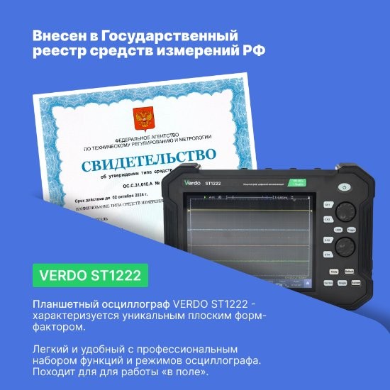 Двухканальный осциллограф планшетного типа VERDO ST1222 характеризуется уникальным плоским форм-фактором, ориентированным на использование в «полевых условиях», вдали от удобного стола лаборатории и электрической розетки. Противоударный хольстер планшетного осциллографа VERDO ST1222 защищает от последствий случайного падения, а мощная батарея 8000 мАч обеспечивает до 5 часов непрерывной работы. Небольшие размеры и вес прибора отлично сочетаются с большим мультисенсорным экраном 8”, занимающим большую часть лицевой панели прибора, профессиональным набором функций и режимов осциллографа, включающим даже декодирование протоколов последовательных шин I2C, SPI, CAN, UART/RS232. Цифровой осциллограф VERDO ST1222 также оснащен встроенным мультиметром с функцией регистратора.
