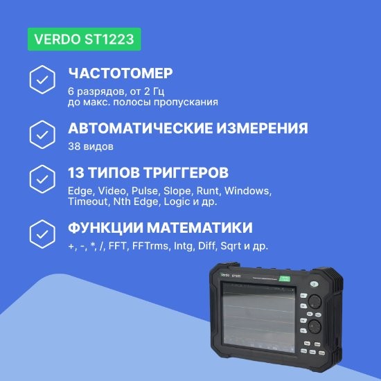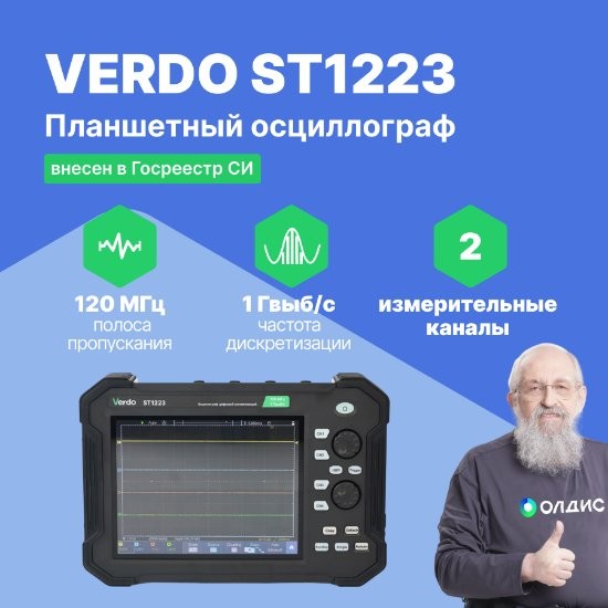 Двухканальный осциллограф планшетного типа VERDO ST1223 характеризуется уникальным плоским форм-фактором, ориентированным на использование в «полевых условиях», вдали от удобного стола лаборатории и электрической розетки.