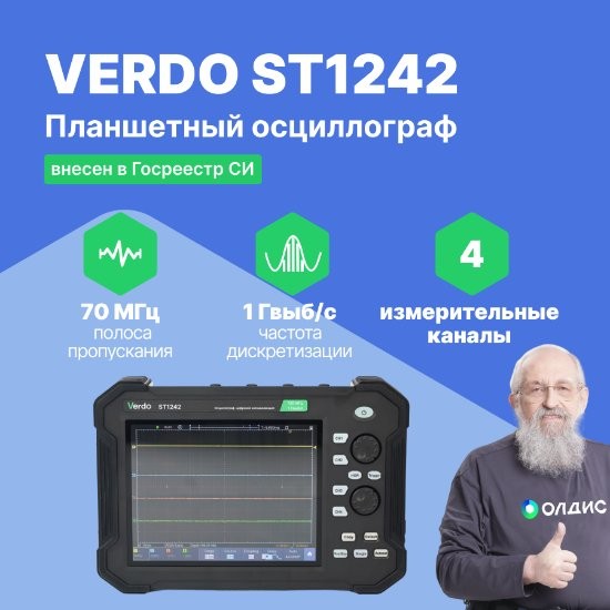 Четырехканальный осциллограф планшетного типа VERDO ST1242 характеризуется уникальным плоским форм-фактором, ориентированным на использование в «полевых условиях», вдали от удобного стола лаборатории и электрической розетки.