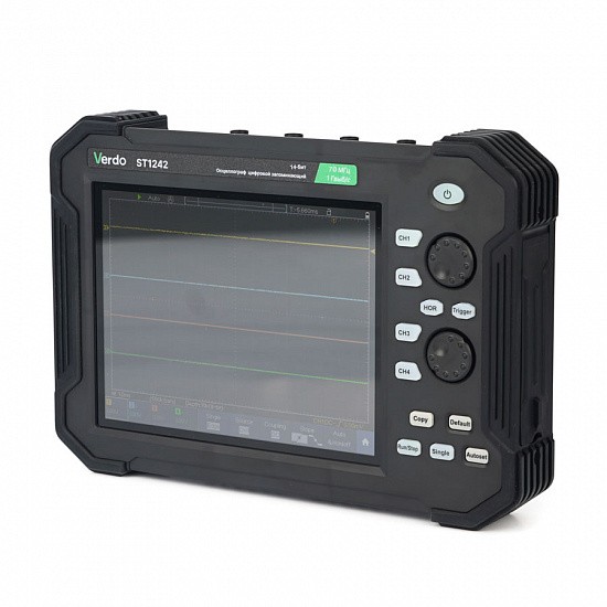 Противоударный хольстер планшетного осциллографа VERDO ST1242 защищает от последствий случайного падения, а мощная батарея 8000 мАч обеспечивает до 5 часов непрерывной работы. Небольшие размеры и вес прибора отлично сочетаются с большим мультисенсорным экраном 8”, занимающим большую часть лицевой панели прибора, профессиональным набором функций и режимов осциллографа, включающим даже декодирование протоколов последовательных шин I2C, SPI, CAN, UART/RS232. Цифровой осциллограф VERDO ST1244 имеет АЦП с переключаемым режимом 8/12/14 бит.