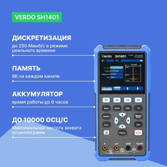 Портативный осциллограф ручной VERDO SH1401 это комбинация в одном компактном корпусе двухканального цифрового осциллографа с полосой до 40 МГц и 4½- разрядного TrueRMS мультиметра.