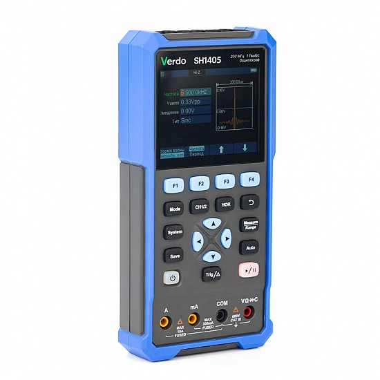Портативный осциллограф ручной VERDO SH1405 это комбинация в одном компактном корпусе двухканального цифрового осциллографа с полосой до 100 МГц и 4½- разрядного TrueRMS мультиметра.